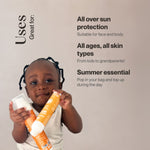 Apply liberally before sun exposure, and reapply regularly throughout the day, especially after swimming or sweating, making sure you’ve covered all areas of exposed skin, including the back of the neck, legs, arms etc.