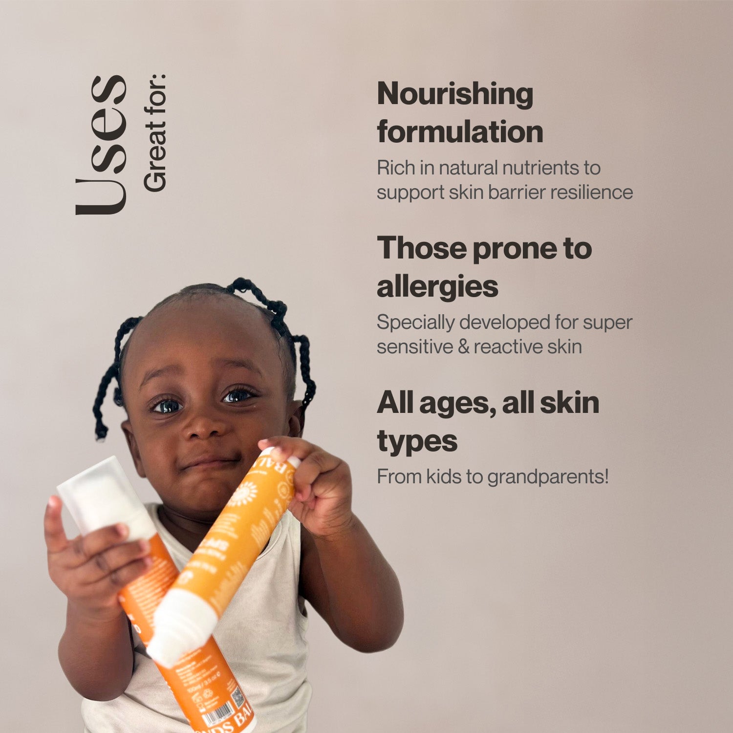 The formulations are allergy friendly - i.e. they don’t contain any of the common allergens most likely to cause a reaction: soy, dairy, nuts, harsh preservatives, alcohol, fragrance etc. - and they have been developed with sensitive and reactive skin in mind.